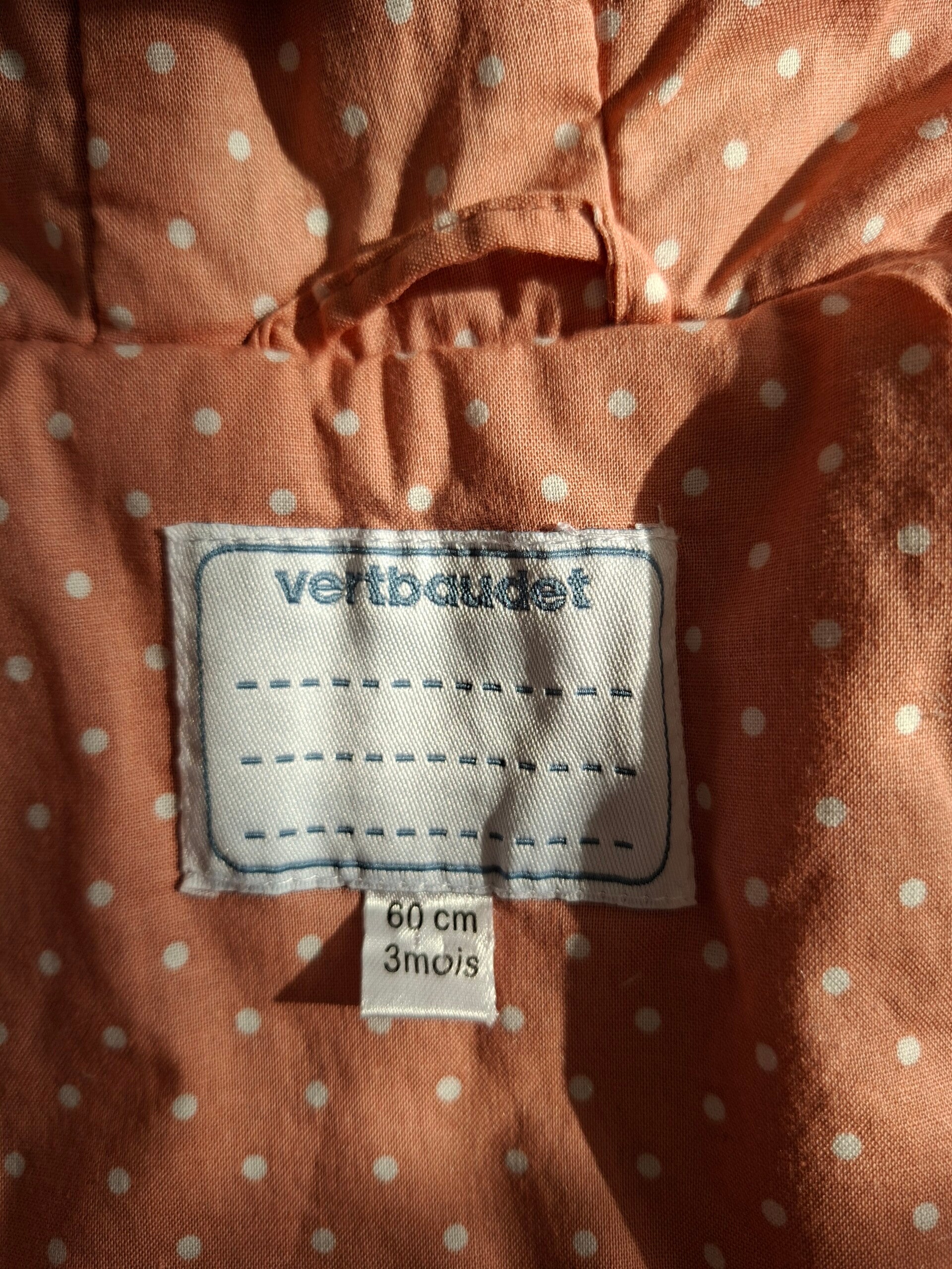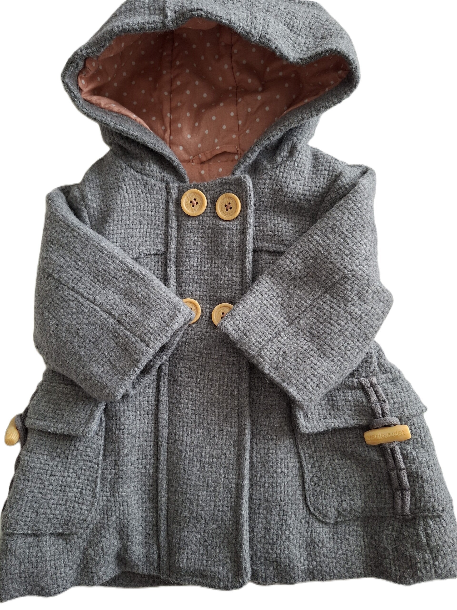 L'élégance à l'anglaise ! Adorable duffle-coat Vertbaudet 3 mois en drap de laine bouclé. Les brandebourgs en bois et la doublure à pois lui donnent un style chic et très chaud pour l'hiver.